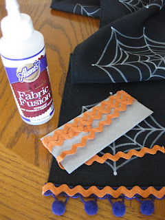 Finally, glue (or sew!) the rick rack on top of the upper portion of the pom pom fringe. Again, fold ends to the back of fabric. Let dry.....