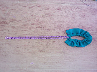 Fold ribbon or fabric over so that the top comes down to middle of the ribbon. (If you want a double ruffle, simply fold in half) and sew to make a pocket.