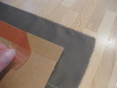 Next, I laid my cardboard down on the back of the fabric and used double stick tape (you can use hot glue or craft glue) and began folding my edges over.